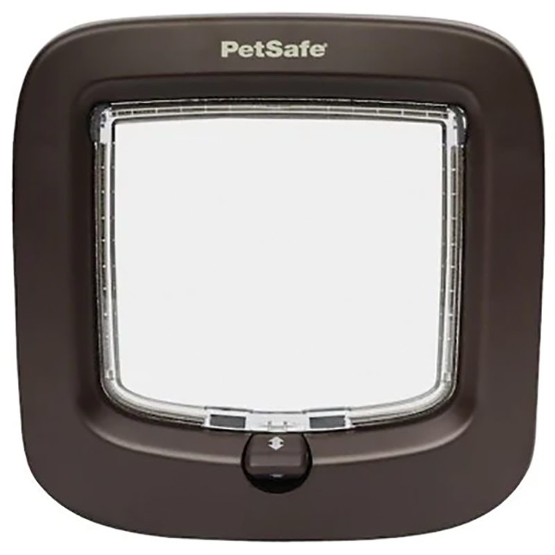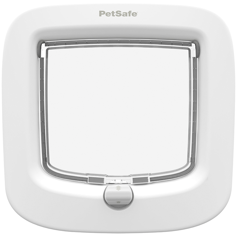 Kunststoff mit transparenter, leicht auswechselbarer Klappe, für alle Türen, Fenster und Wände bis Dicke 51 mm, der manuelle 4-Weg-Verschluss wurde in die Mitte versetzt, dadurch ist die Türe sicherer betreffend Überdrücken von Fremdtieren,