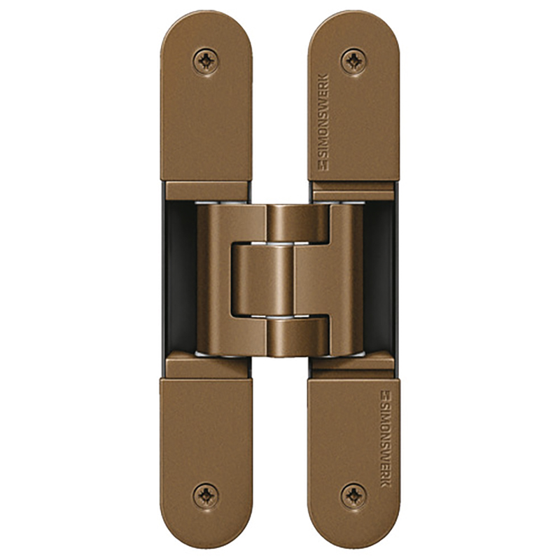 Grundmaterial bestehend aus Zinkdruckguss, Aluminium und Stahl, komplett verdeckt liegend, für ungefälzte Türen an Holz- und Stahlzargen, 3-dimensionale Verstellmöglichkeit, Seiten- und Höhenverstellung ±3 mm, Andruck ±1 mm, wartungsfreie Gleitlagertechnik, Öffnungswinkel bis 180°, Tragkraft bei 2 Band ca. 60 Kilo