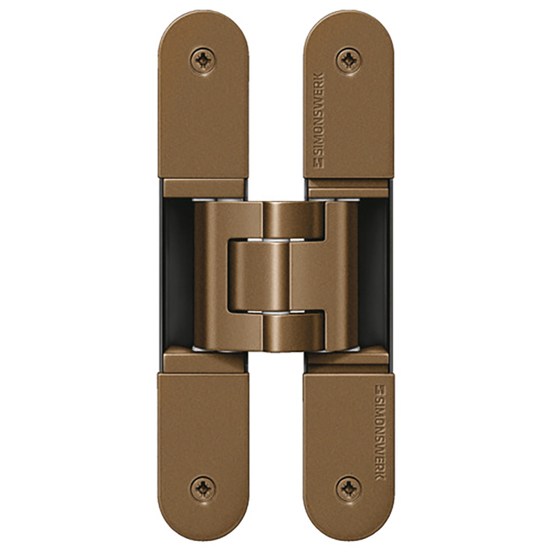 Grundmaterial bestehend aus Zinkdruckguss, Aluminium und Stahl, komplett verdeckt liegend, für ungefälzte Türen an Holz- und Stahlzargen, 3-dimensionale Verstellmöglichkeit, Seiten- und Höhenverstellung ±3 mm, Andruck ±1 mm, wartungsfreie Gleitlagertechnik, Öffnungswinkel bis 180°, Tragkraft bei 2 Band ca. 80 Kil