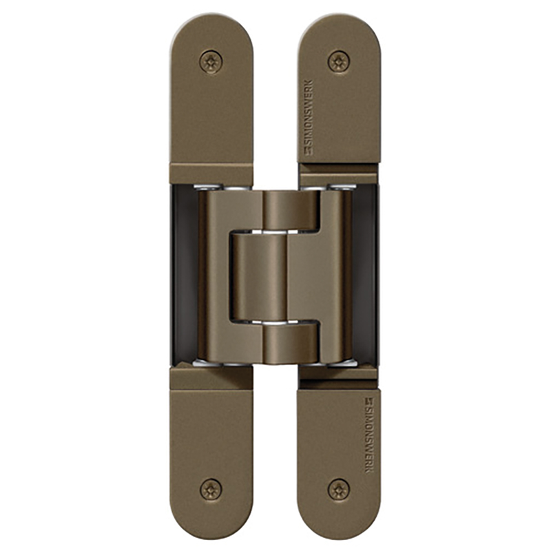 Grundmaterial bestehend aus Zinkdruckguss, Aluminium und Stahl, komplett verdeckt liegend, für ungefälzte Türen an Holz- und Stahlzargen, 3-dimensionale Verstellmöglichkeit, Seiten- und Höhenverstellung ±3 mm, Andruck ±1 mm, wartungsfreie Gleitlagertechnik, Öffnungswinkel bis 180°, Tragkraft bei 2 Band ca. 120 Kilo