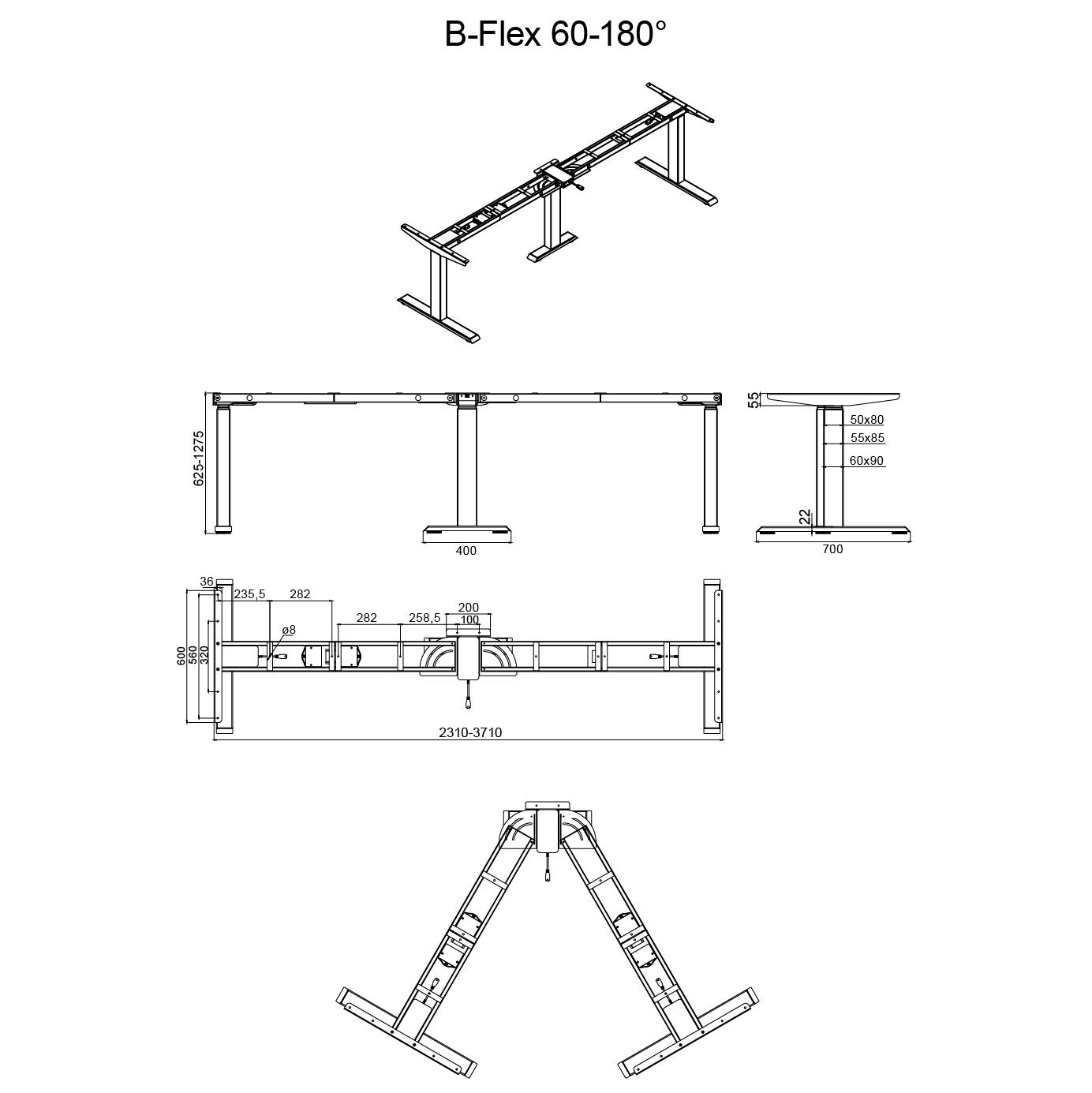 - Rahmenbreite: 2310 - 3710 mm bei 180° Montage