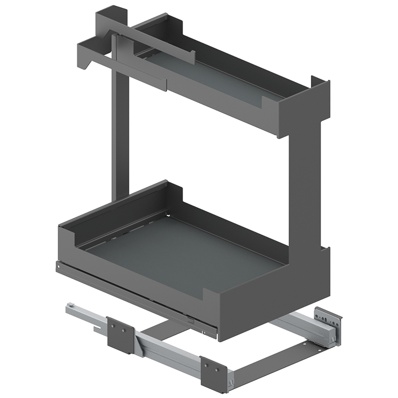 Stahlblech pulverbeschichtet, Vollauszug, integrierter Softclose, Frontauszug öffnen und Innenauszug mit 2 Etagen Staufläche herausziehen, Tragkraft 0 - 25 Kilo, mit Korpusschiene Nova Pro, ohne Relingeinsatz-Set