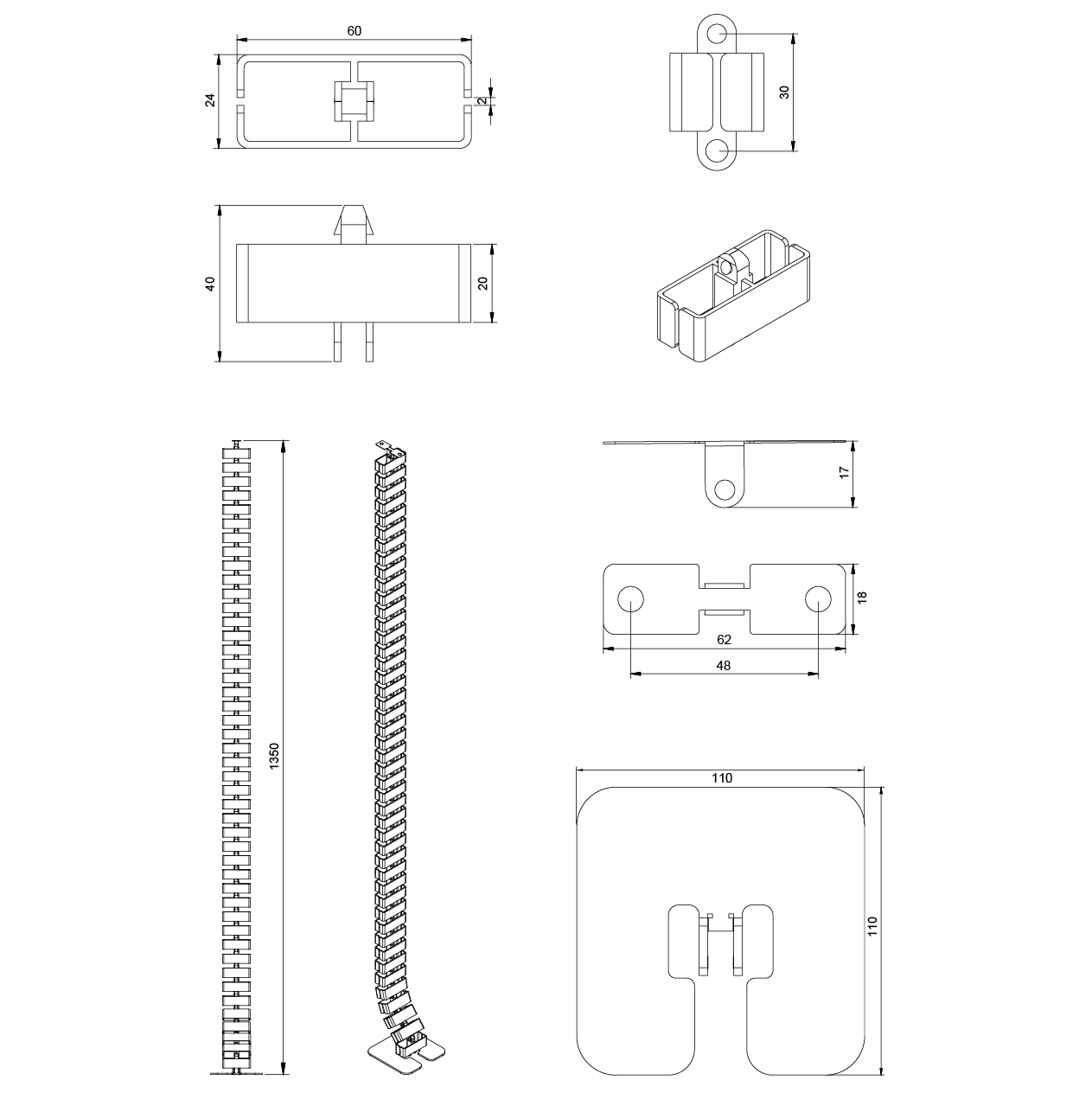 Kunststoff Kabelsäule für höhenverstellbare Sitz- und Steharbeitsplätze, mit vertikaler Tischanbindung und Standfuss inkl. Schrauben, bestehend aus 45 Kettengliedern für eine maximale Höhe von 1350 mm, mit zwei getrennten Kabelwege, die Kabelführung kann freihängend oder mithilfe eines Magnethalters am Tischbein befestigt werden, die Länge lässt sich durch einfaches entfernen einzelner Kettenglieder flexibel anpassen