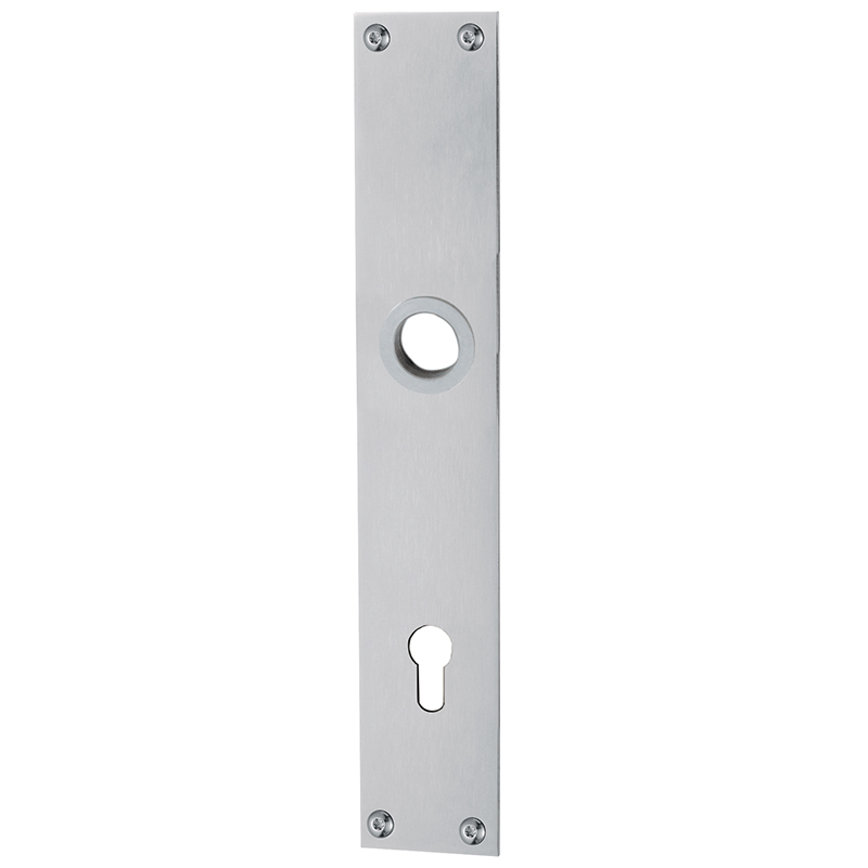 Messing matt verchromt, Drückerführung 16 mm, oberes Schraubenloch bis Mitte Drückerführung 81 mm, mit Schrauben