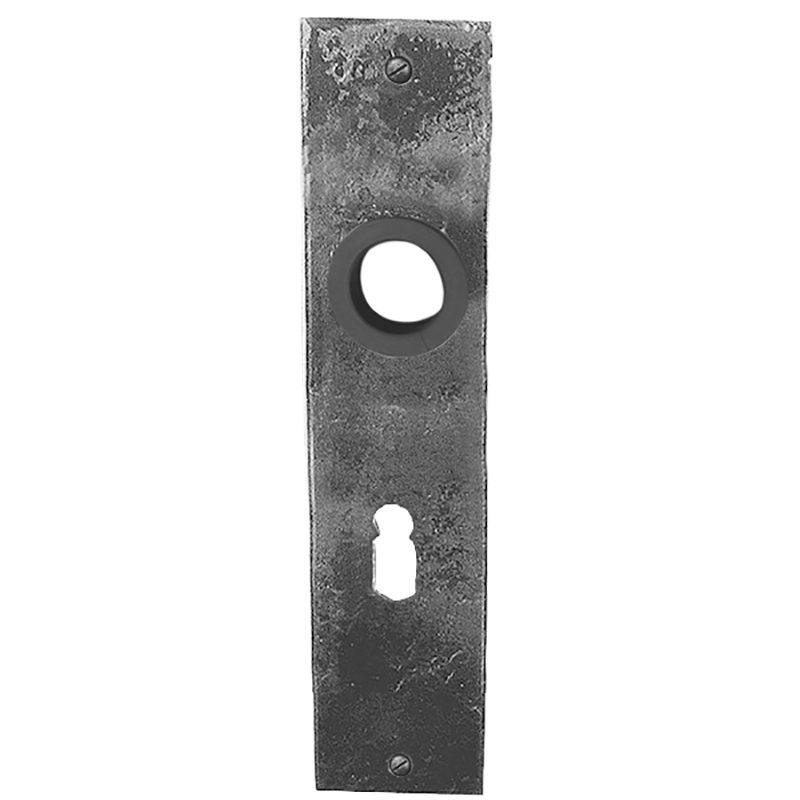 Eisen naturblank (geringe Korrosionsbeständigkeit), Distanz Drückerloch - oberes Schraubenloch 40 mm, Schrauben im Lieferumfang enthalten
