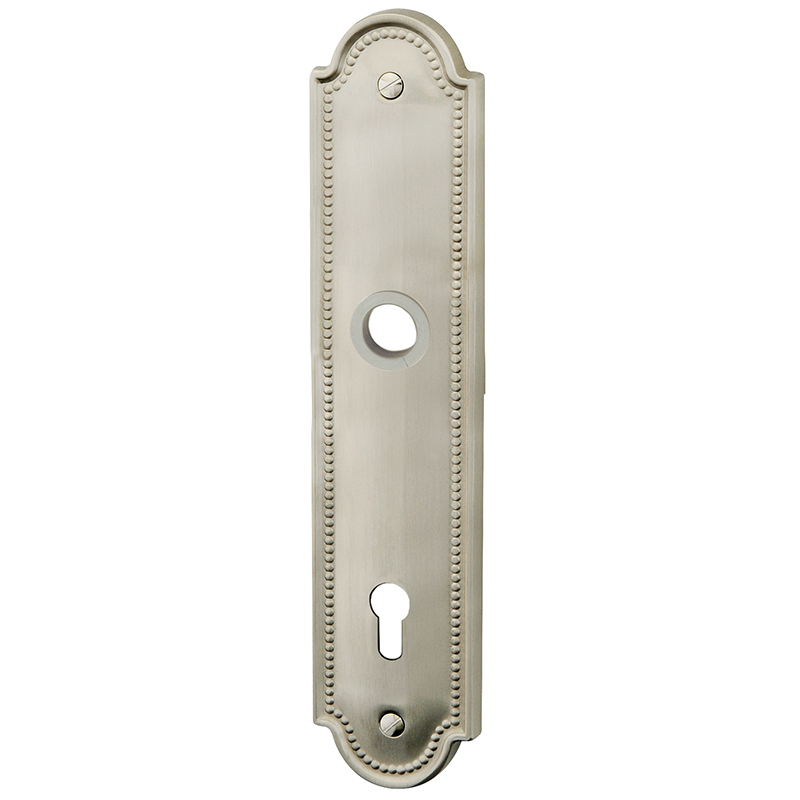 Messing matt vernickelt, Drückerführung 16 mm, oberes Schraubenloch bis Mitte Drückerführung 68 mm, mit Schrauben