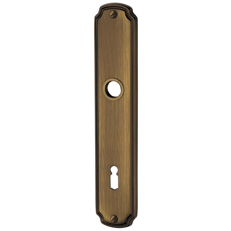 Messing brüniert, Drückerführung 16 mm, oberes Schraubenloch bis Mitte Drückerführung 69 mm, mit Schrauben
