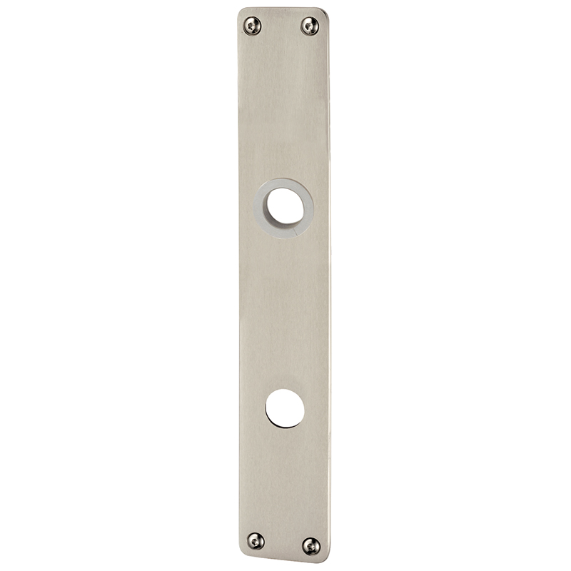 Messing matt vernickelt, Drückerführung 16 mm, oberes Schraubenloch bis Mitte Drückerführung 70 mm, mit Schrauben