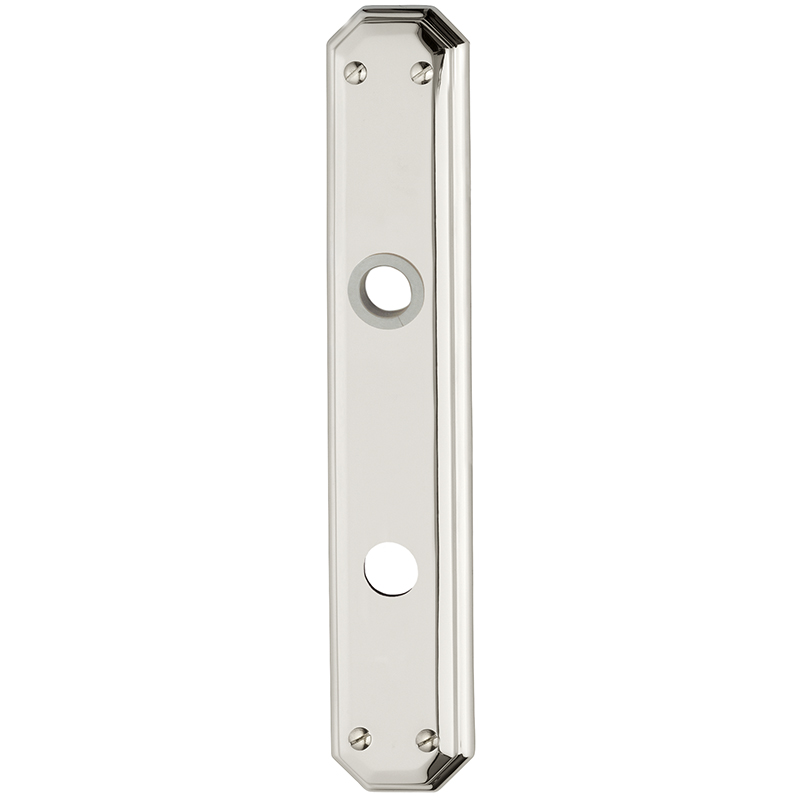 Messing poliert vernickelt, Drückerführung 16 mm, oberes Schraubenloch bis Mitte Drückerführung 64 mm, mit Schrauben