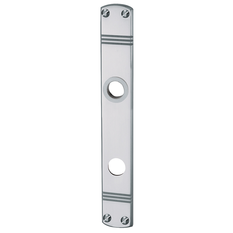 Messing poliert verchromt, Drückerführung 16 mm, oberes Schraubenloch bis Mitte Drückerführung 70 mm, mit Schrauben