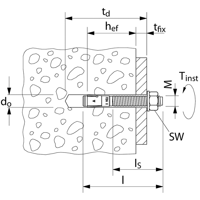 der FBN II ist ein Stahlanker für wirtschaftliche Befestigungen in ungerissenem Beton, dank des langen Gewindes und der zwei Verankerungstiefen ist der Bolzenanker FBN II besonders flexibel einzusetzen, neben der Vorsteck- und der Durchsteckmontage ist der Bolzenanker auch für die Abstandsmontage geeignet,