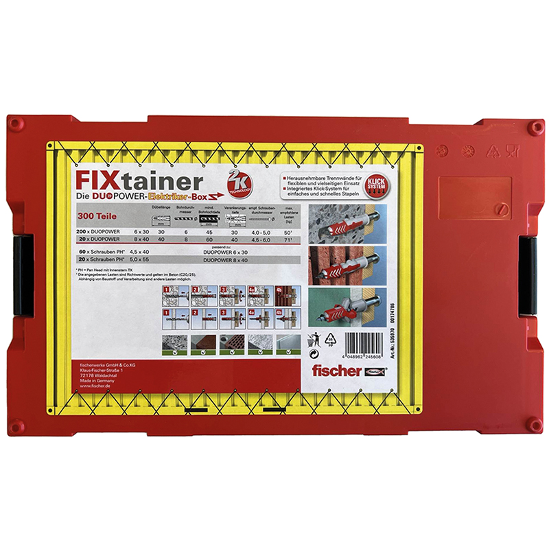hochwertiger FixTainer zum Nachfüllen, variable Fächer durch herausnehmbare Trennwände sorgen für die optimale Ordnung, DuoPower- zwei Materialkomponenten für beste Lastwerte und intelligente Funktionen je nach Untergrund, der schmale Dübelrand verhindert das Durchrutschen ins Bohrloch, bestmögliche Rückmeldung (Feelgood-Faktor) des Dübels. Man spürt wenn der Dübel perfekt sitzt, die ausgeprägte Mitdrehsicherung verhindert das Mitdrehen des Dübels, mit passenden Schrauben,