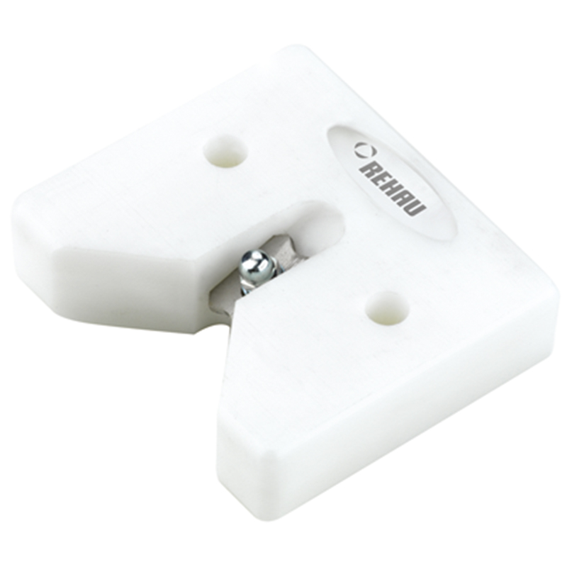 Gehäuse Kunststoff, mit schräg stehender Ziehklinge, zum Anbringen von Radien an Geraden und Aussenradien einer Plattenkontur, Bearbeitungsmöglichkeit aller üblichen Kantenwerkstoffen, die Ziehklinge ist höhenverstellbar und muss je nach erforderlichem Radius am Kantenband eingestellt werden, für Kantenstärken 2 oder 3 mm entsprechend der eingesetzten Ziehklinge, mit Ziehklinge 3 mm