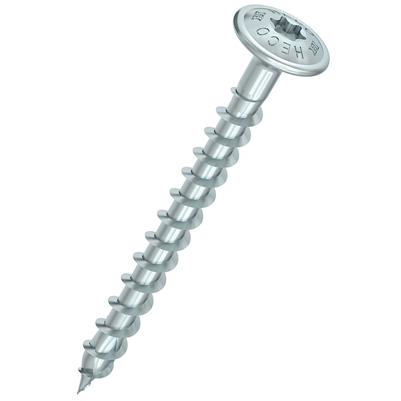 Stahl verzinkt, Vollgewinde, mit Torx, mit den innovativen Eigenschaften HECO-Drive, GripFit (erlaubt einhändiges Arbeiten), MagicClose (patentiertes Vollgewinde zieht Holzbauteile ohne Vorspannen spaltfrei zusammen) und PerfectPitch (optimale Gewindesteigung für jede Schraubenlänge), einem neuen, einheitlichen Antriebsgrössenkonzept ist HECO-TOPIX®-plus die perfekte Holzschraube für praktisch alle Anwendungen, Zulassung ETA-19/0553
