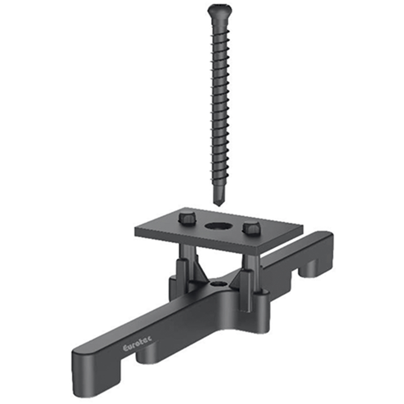 Kunststoff schwarz, glasfaserverstärkt mit Edelstahlplatte A2 schwarz und Edelstahlschraube Ø 4,2 x 43 mm Torx 15 gehärtet schwarz, für unsichtbare Befestigung von Terrassendielen im Aussenbereich, integrierter Abstandhalter für ausreichenden Abstand zwischen Terrassenbelag und Unterbau und einem Fugenabstand von 6 mm, einfach und rationell durch seitliche Montage in Nut, ein Nachjustieren sowie der Austausch von einzelnen Dielen ist jederzeit möglich