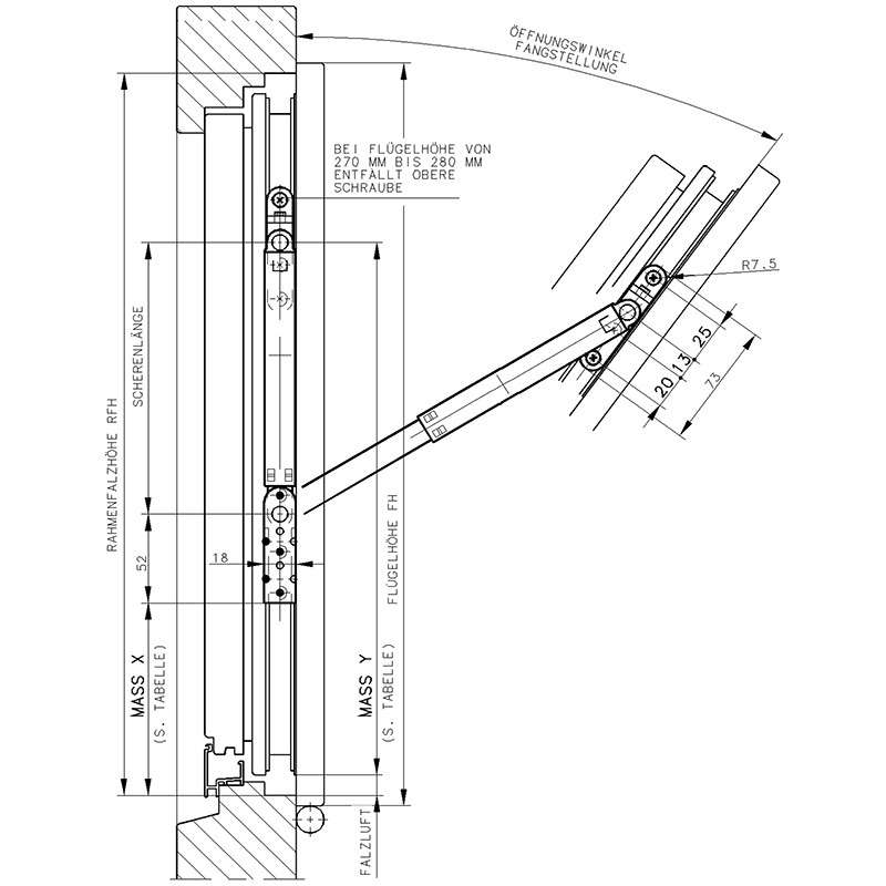 70° bis 90°, Falztiefe min. 18 mm, Falzluft min. 11,5 mm