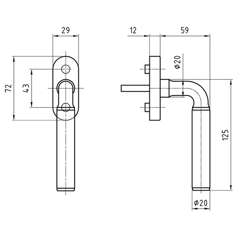- Fenstergriff für paarweise Montage ab Werk.