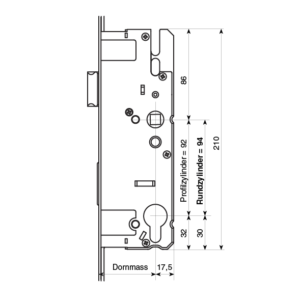 silberfarbig, mit rollendem Sicherheitszapfen (RS), Stulpbreite 16 mm, mit Riegel, Hinterdornmass 17,5 mm, Schlosskastenhöhe 210 mm, Schlosskastendicke 16 mm, Ausschnittdistanz Rundzylinder 94 mm, Griffhöhe 800 - 1000 mm, Stulplänge 1960 mm, Falle von rechts auf links umstellbar
