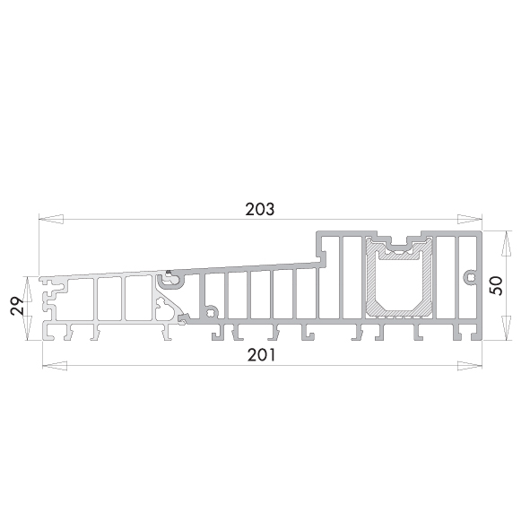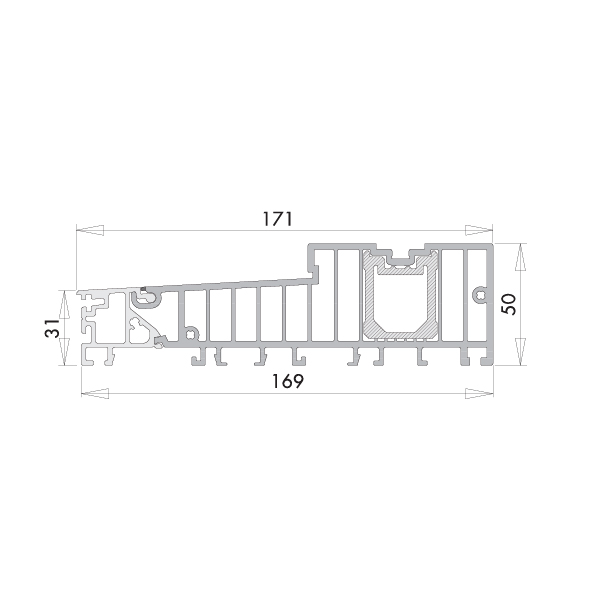 Alu/Kunststoff, RAL7035 lichtgrau, Bauhöhe 50 mm, geeignet für Holz und Holz-Metall Elemente mit verschiedenen Flügeldicken, Bodenschwelle mit Aufnahmenuten für Laufschiene, Wetterschenkel, Abdichtblech, Ausgleichsschiene und Amex Wetterschenkel
