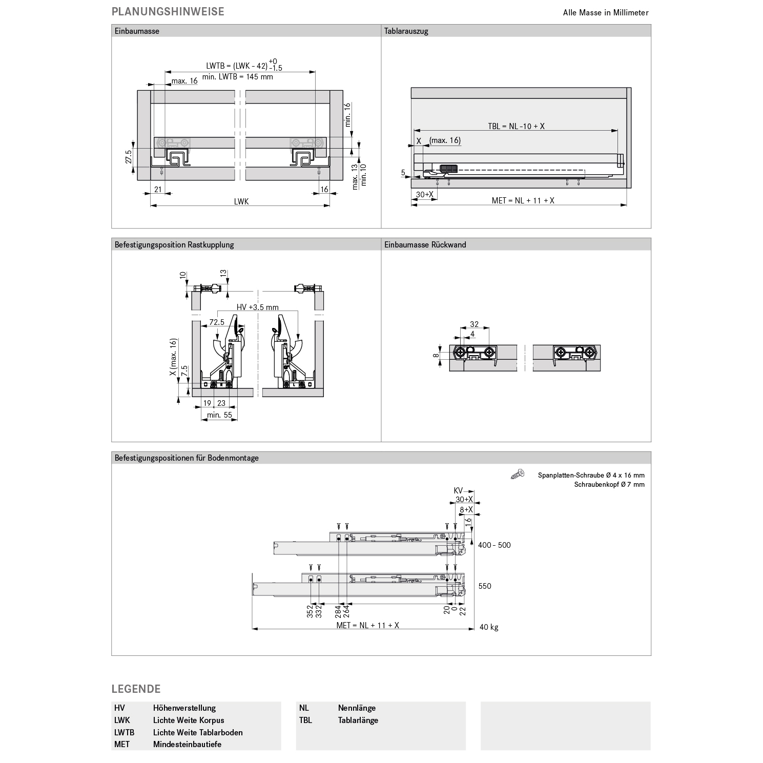 verdeckt liegendes Führungssystem für Auszugstablare, Vollauszug mit synchronisiertem Bewegungsablauf, stufenlose Selbstarretierung der Schublade beim Aufschieben auf die Führung, integrierte, werkzeuglose Höhenverstellung + 3,5 mm, Montage auf Korpus- oder Zwischenboden