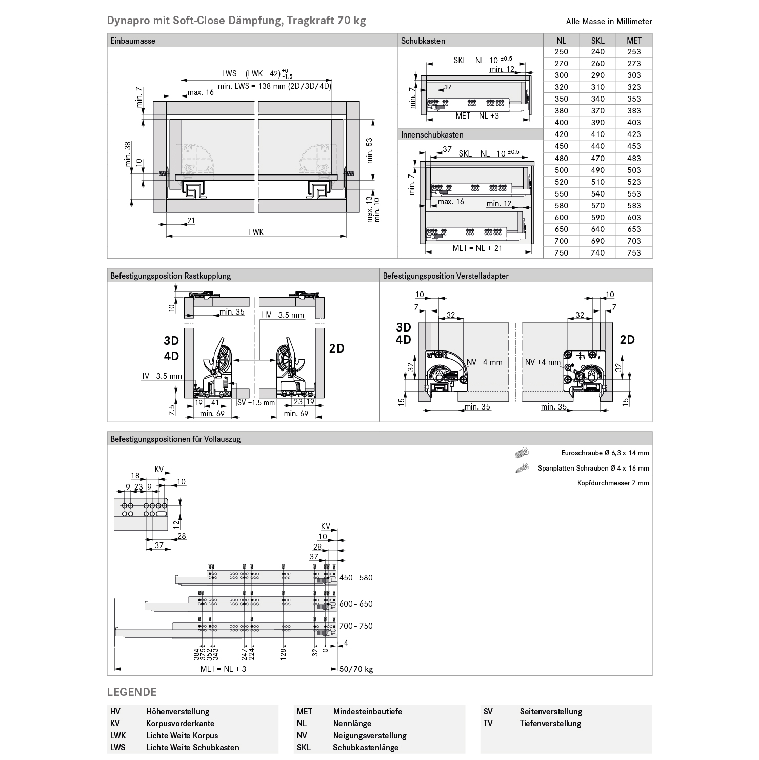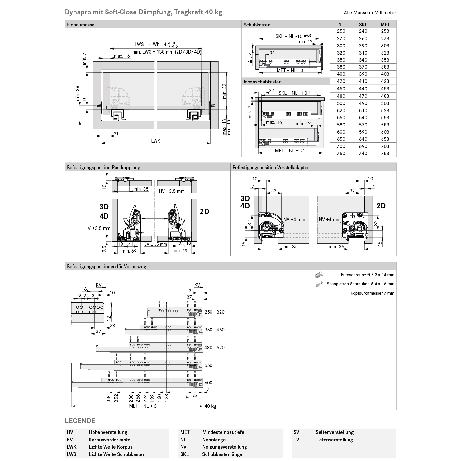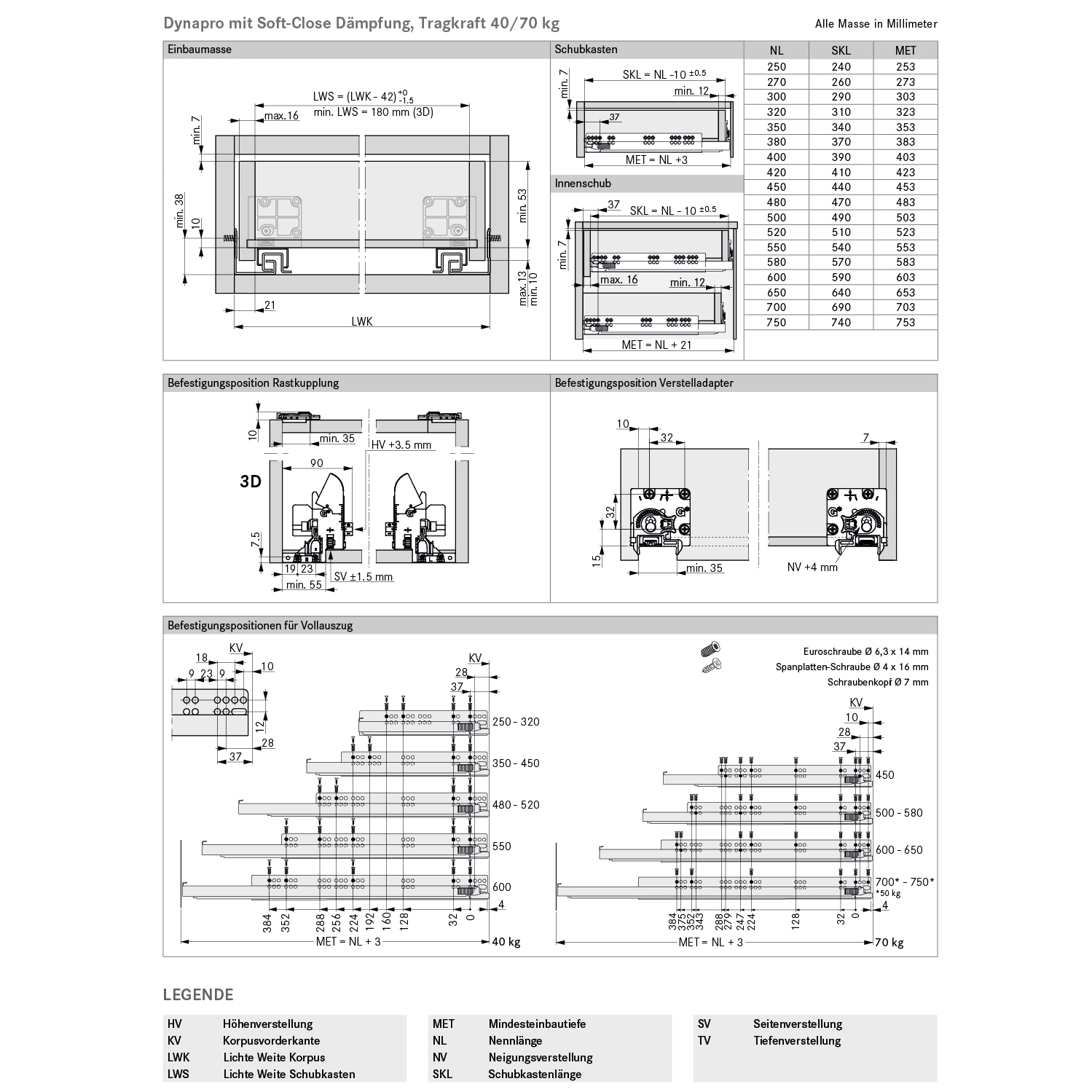 3-dimensional verstellbar, verdeckt liegendes Führungssystem für Holzschubladen, Vollauszug mit synchronisiertem Bewegungsablauf, stufenlose Selbstarretierung der Schublade beim Aufschieben auf die Führung, integrierte, werkzeuglose Höhenverstellung + 3,5 mm, Verstelladapter für werkzeuglose Seitenverstellung ± 1,5 mm, Neigungsverstellung + 4 mm