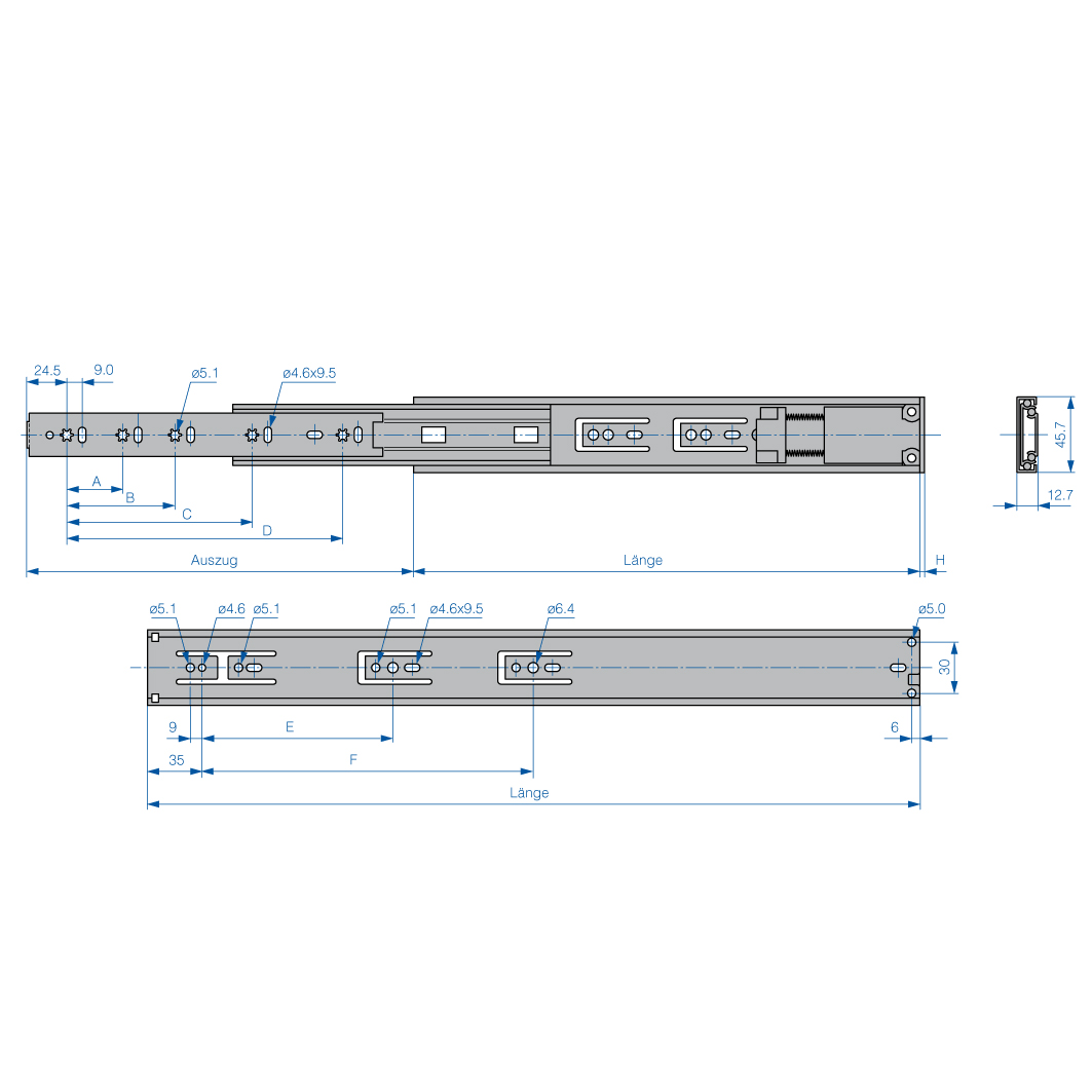 Stahl glanzverzinkt, mit Selbsteinzug und Dämpfung, Schnellentriegelung, die Schublade kann über Entriegelungshebel von der Führung getrennt werden, der Auszug wird im geschlossenen Zustand über Federkraft gehalten