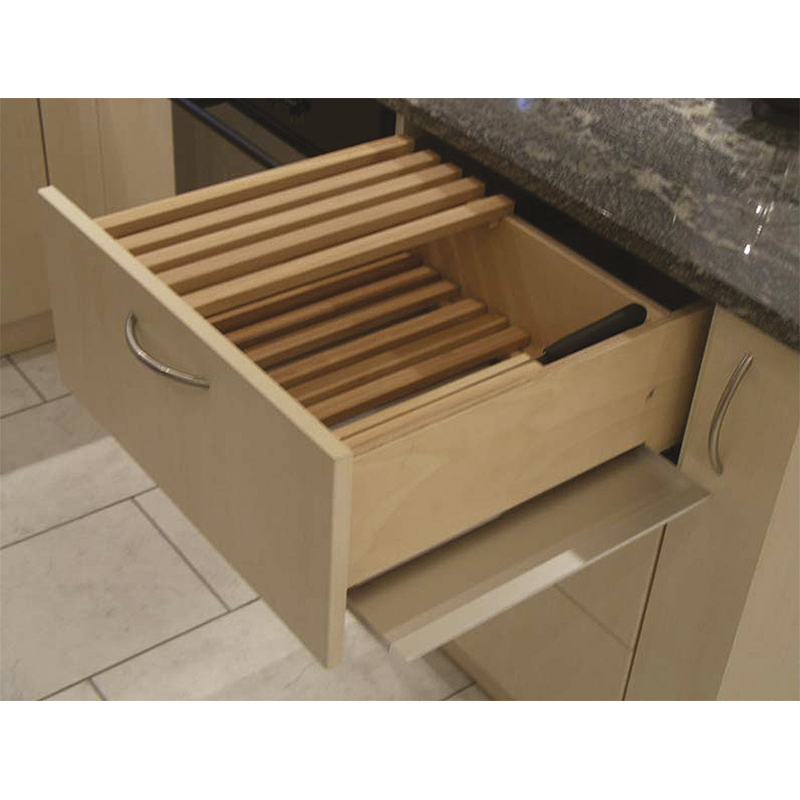 Seiten, Rückwand und Front in Sperrholz 15 mm unbehandelt, Boden Sperrholz 12 mm Buche, Rost in Schublade Buche massiv, Schneiderost Buche massiv, mit 1 Brotmesser 340 mm, Brotkrümelschublade Aluminium, beidseitig ausziehbar, für 2/6 Schublade (mind. 254 mm), ohne Frontdoppel