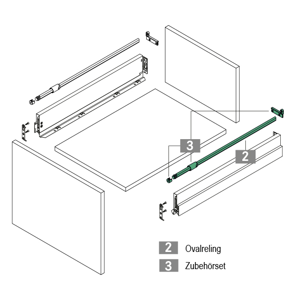 Ovalreling zum Ablängen, mit Stellschraube aus natureloxiertem Aluminiumrohr, hohe Biegefestigkeit und kratzfeste Oberfläche, hohe Stabilität und Tragkraft durch sichere Schraubverbindung an Blende und Rückwand, werkzeuglose Neigungsverstellung über die Ovalreling, ohne Zubehör-Set