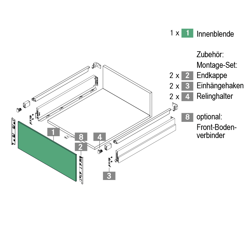 für überbreite Schubladen ab Korpusbreite 600 mm, zur festen Verbindung der Innenblenden mit dem Schubladenboden
