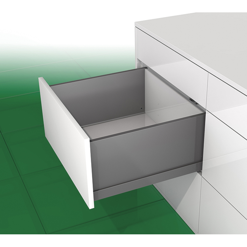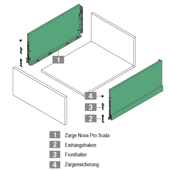 Hohlkammerzargensystem beschichtet weiss, silber oder anthrazit, vorgerichtet für Korpusschienen Nova Pro, integrierte Höhen-, Seiten- und Neigungsverstellung, hohe Stabilität bis 780 mm Fronthöhe, geringe Einbaubreite und gerade Innenseite für mehr Stauraum, mit Wischlippe für optimale Hygiene, werkzeuglose Montage und Demontage der Front, keine Bodenbearbeitung notwendig, individualisierbar durch Designleisten, mit 2 Zargensicherungen zum Anschrauben, links / rechts verwendbar, ohne Einhängehaken und Fronthalter