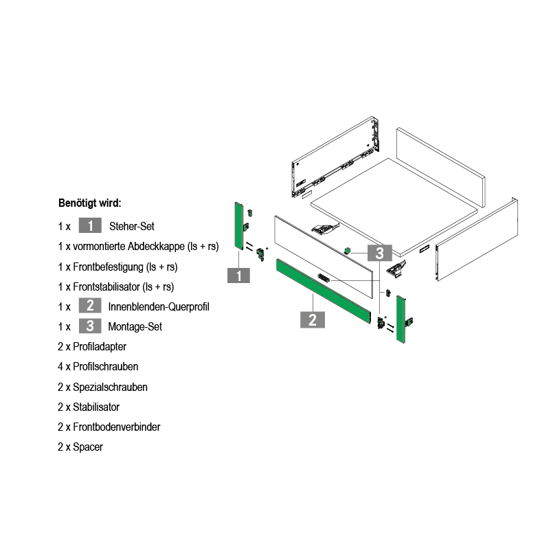 Montage-Set für 1 Schublade besteht aus: