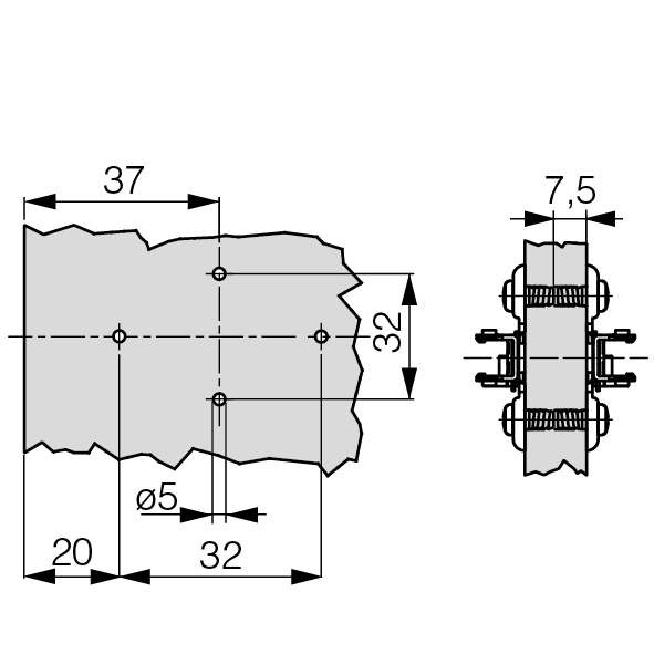 Stahl vernickelt, 4-Punkt-Befestigung mit vormontierten Schrauben und Dübeln Ø 5 mm, mit komfortabler Höhenverstellung über Gewindeschnecke, Grundplatten mit Dübellänge 7,5 mm sind für Zwillingsanschlag geeignet