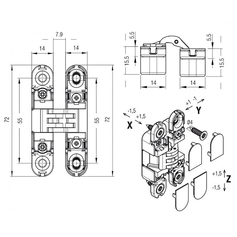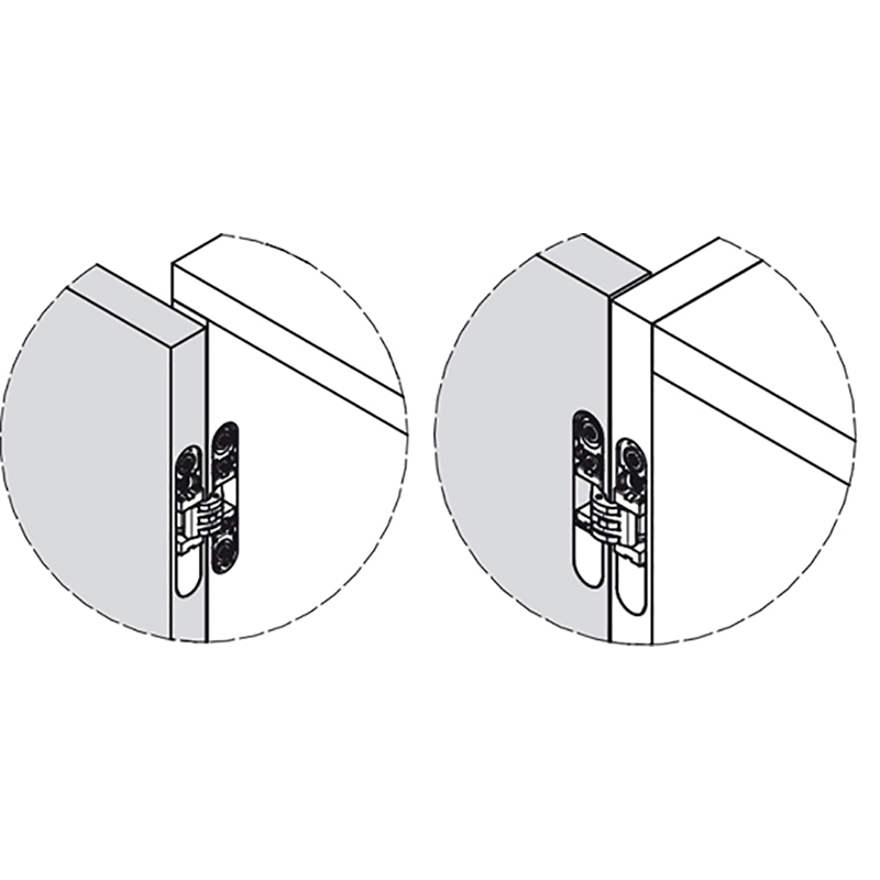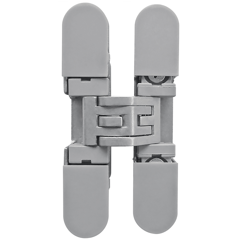 Zamak matt verchromt, links und rechts verwendbar, verdeckte Montage, 3-dimensional verstellbar, horizontal ± 1 mm, vertikal ± 1,5 mm, Tiefe ± 1,5 mm, Öffnungswinkel 180°, zum Einlassen, Tragkraft bis zu 10,5 kg mit zwei Türbänder, 14 kg mit drei Türbänder und 19 kg mit 4 Türbänder, Abdeckkappe grau