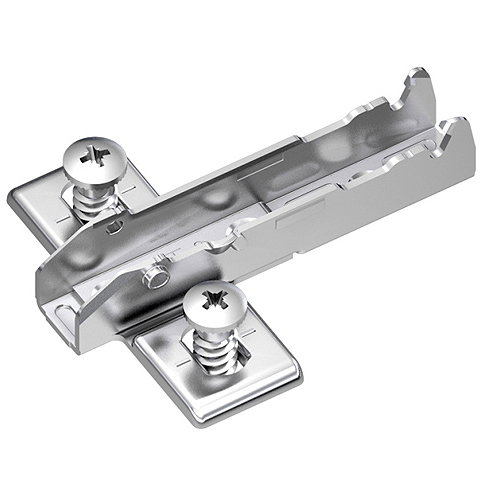 Zink vernickelt, Befestigung durch türseitiges Verkleben eines Adapters, je nach Position des Adapters als Eck-, Mittel- und Innenband einsetzbar, Verbindung des Bandes mit dem Adapter über Exzenter, mit negativer Federung im Scharnierarm unterstützt das Öffnen von grifflosen Türen, 3-dimensionale Verstellung mit entsprechender Grundplatte, schnelle Endmontage ohne Glasbohrung, hohe Auflage bis 19 mm, ohne Adapter, ohne Abdeckkappe für Bandarm, ohne Grundplatte