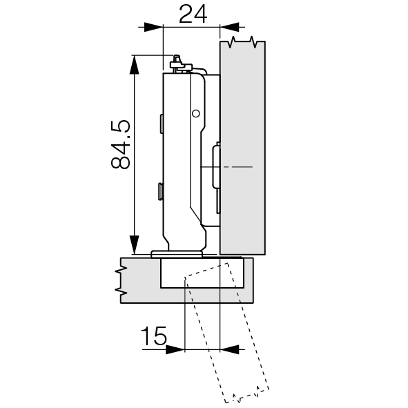 Stahl vernickelt, Topf zum Anschrauben oder zum Einpressen, Dämpfungs-Technologie unsichtbar im Scharnierarm integriert und in drei Leistungsstufen werkzeuglos einstellbar, Höhenverstellung ± 2,5 mm, Tiefenverstellung + 3 / - 2 mm, Seitenverstellung ± 2 mm, Türdicke max. 24 mm, ohne Abdeckkappen, ohne Grundplatte