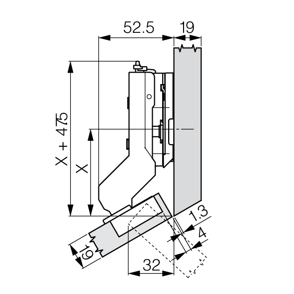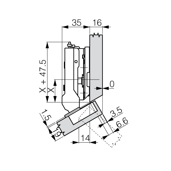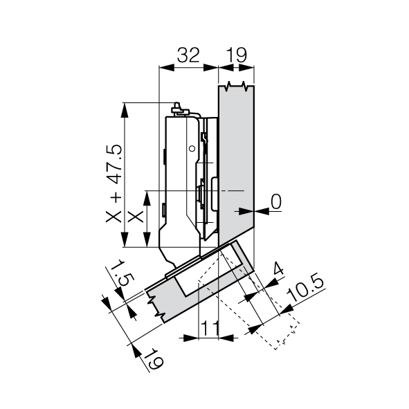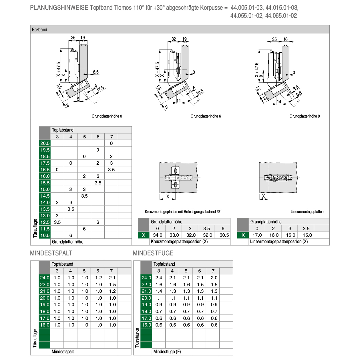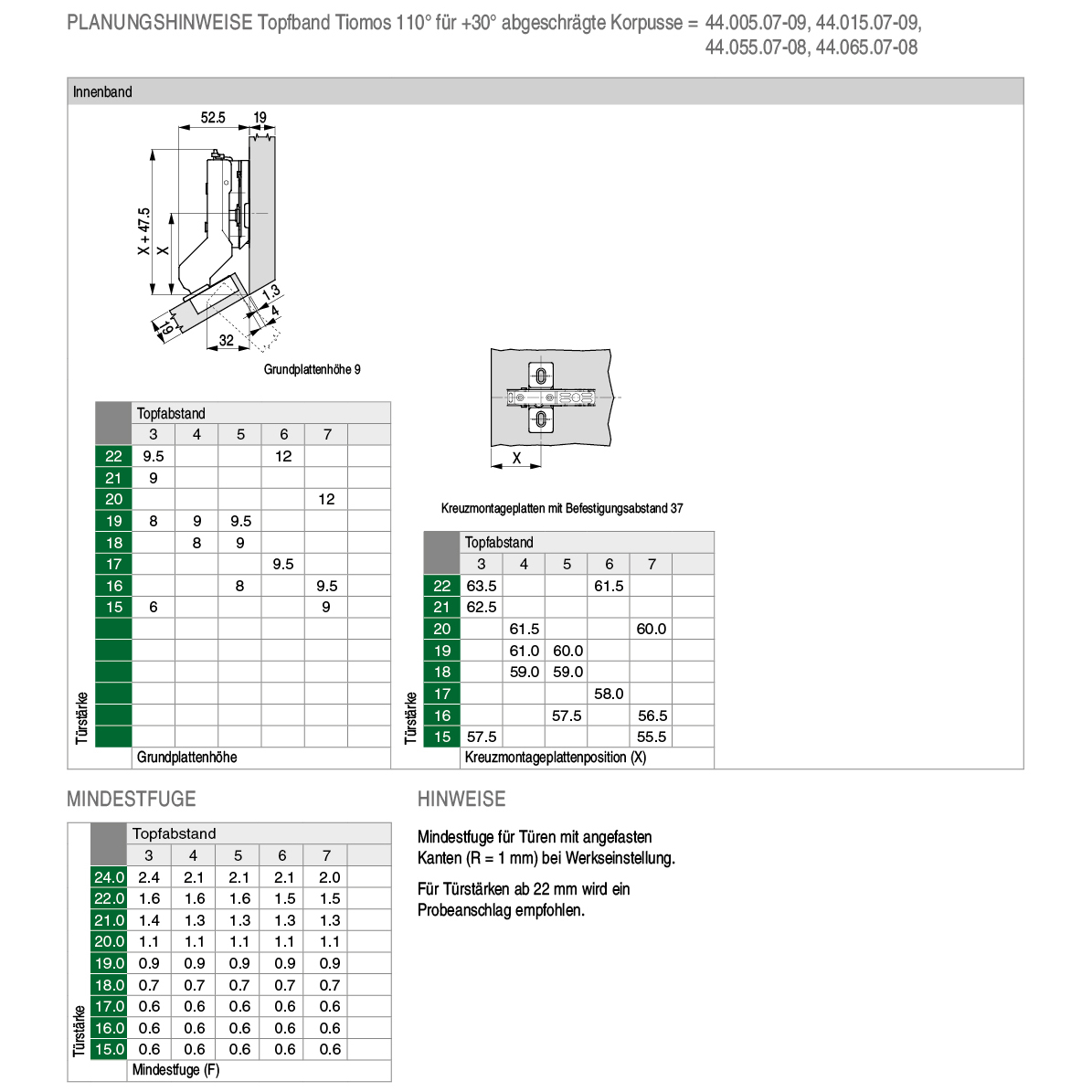 Topfband GRASS® Tiomos 110° Click-on, für +30° abgeschrägte Korpusse, Bohrbild 45 / 9,5