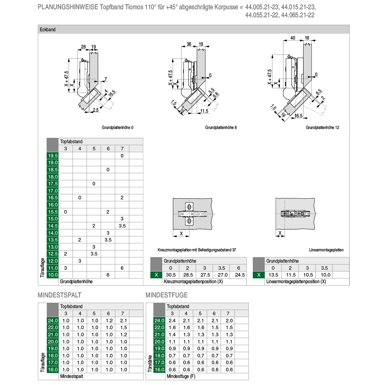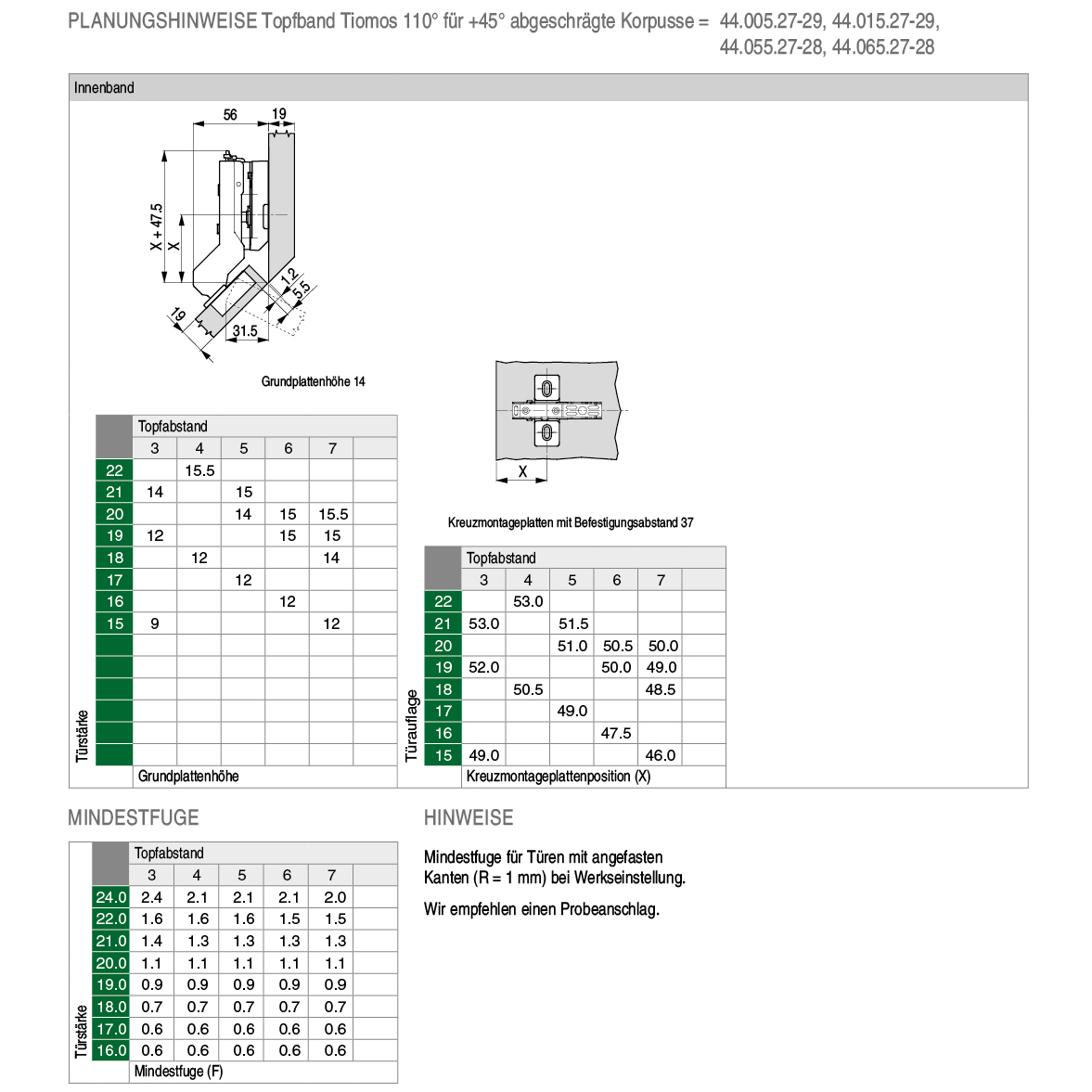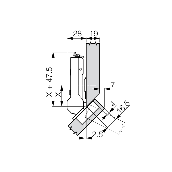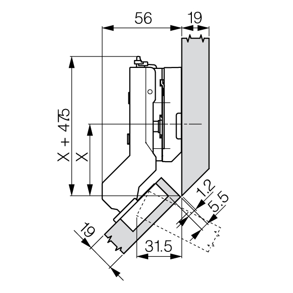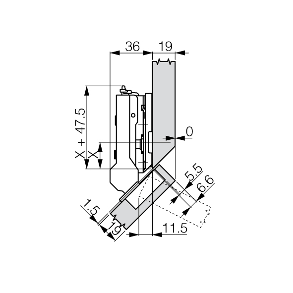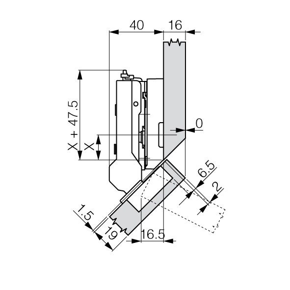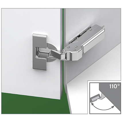 Topfband GRASS® Tiomos 110° Click-on, für +45° abgeschrägte Korpusse, Bohrbild 45 / 9,5