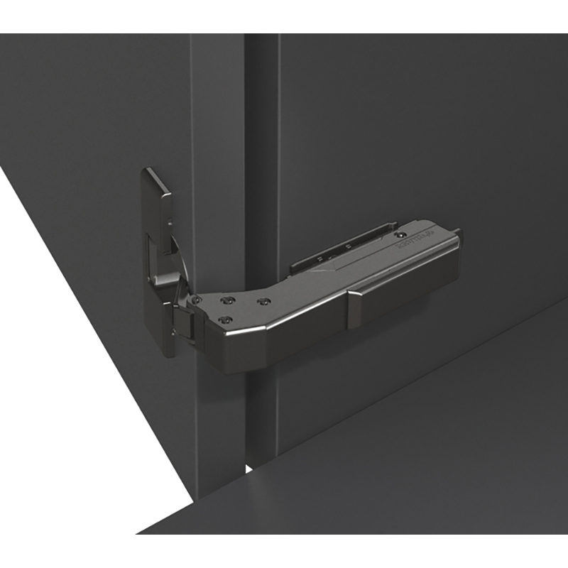 Stahl schwarz, Topf zum Anschrauben, Dämpfungs-Technologie unsichtbar im Scharnierarm integriert und in drei Leistungsstufen werkzeuglos einstellbar, Höhenverstellung ± 2,5 mm, Tiefenverstellung + 3 / - 2 mm, Seitenverstellung ± 2 mm, ohne Abdeckkappen, ohne Grundplatte