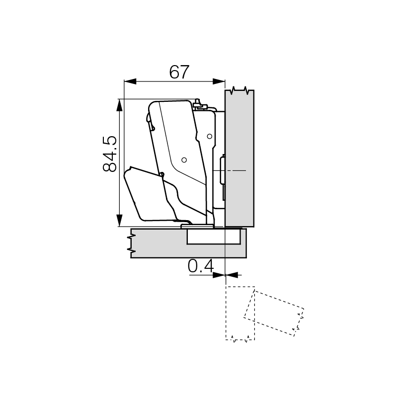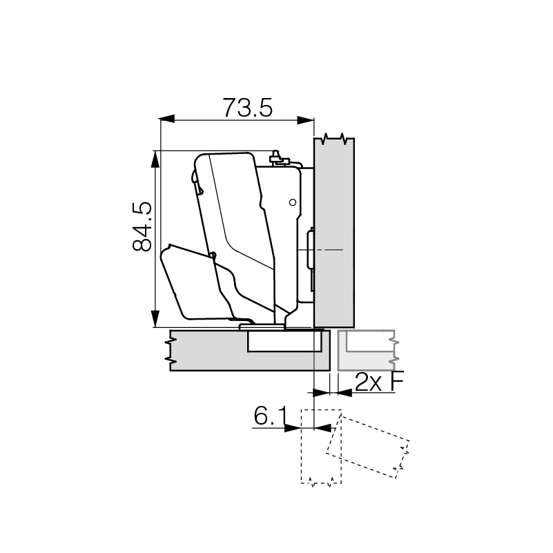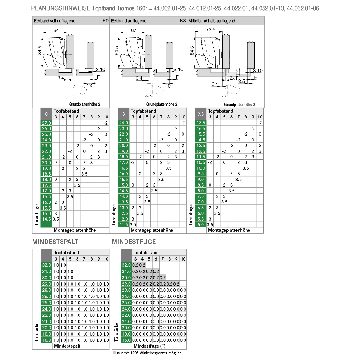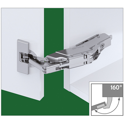 Stahl vernickelt, werkzeuglose Topfschnellmontage, Dämpfungs-Technologie unsichtbar im Scharnierarm integriert und in drei Leistungsstufen werkzeuglos einstellbar, Höhenverstellung ± 2,5 mm, Tiefenverstellung + 3 / - 2 mm, Seitenverstellung ± 2 mm, Türdicke max. 32 mm, ohne Grundplatte
