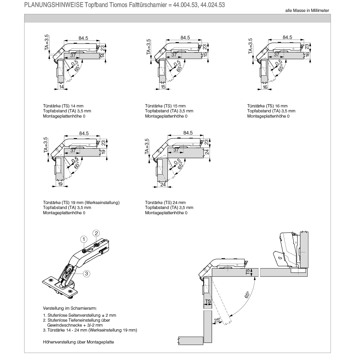 Topfband GRASS® Tiomos 65° Click-on, Falttürscharnier, Bohrbild 45 / 9,5