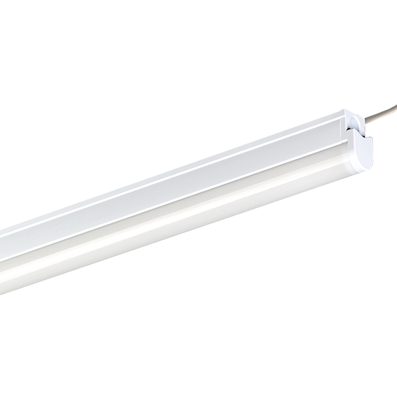 Kunststoffgehäuse weiss mit opaler Abdeckung, Lichtfarbe warmweiss 3000°, 230 Volt, Ra 85, 77 Lm/W, Vorschaltgerät im Sockel eingebaut, mit Befestigungsclips für horizontale Montage, Anschlussleitung an Ministecksystem HV, ohne Anschlussleitung