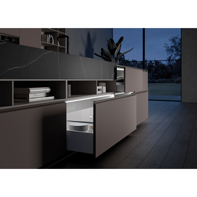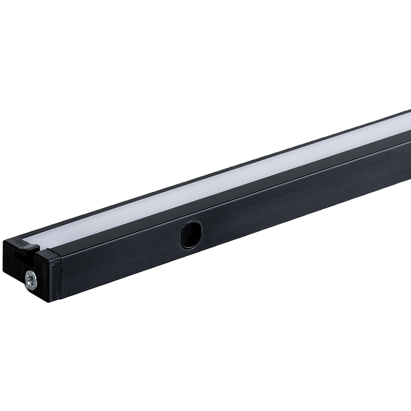 LED-Profil für die Beleuchtung von Schubladen und Abfalleimern, Baski ist mit einem IR-Sensor und End-Anschlag-Sensor für die Installation im Schrank ausgestattet, das Ein- und Ausschalten der Leuchten erfolgt durch das Öffnen und Schliessen des Türflügels, 24 V DC, 3,4 - 16,3 W, RA 80, 85 Lm/W, 3000K, mit IR-Türkontaktschalter, Anschlussleitung 2000 mm mit JMT-Ministecker und beigefügtem schwarzen Kabelkanal, Leuchte kann individuell gekürzt werden