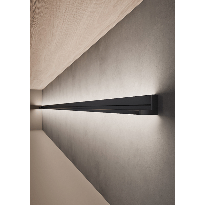 SYSTEMA ist ein strukturelles Beleuchtungsprofil mit doppelter Lichtkammer und Nut für die Zubehörteile der Kollektion, das für die Wandanwendung unter Kücheneinheiten empfohlen wird, das Trägerprofil wurde so konzipiert, dass es eine obere Lichtkammer mit versenkter Optik aufweist, die durch das Verstecken des Lichtaustrittspunkts den Blendeffekt verhindert, die Diffusoren aus opalem Methacrylat, die eine streuende Wirkung haben, verlaufen entlang der gesamten Länge des Profils und bieten eine Kombination aus Wandwaschlichtprojektion auf der Oberseite und funktionaler Lichtprojektion auf der Unterseite, kombinierbar mit Meta-Ablagetablar mit oder ohne USB-Anschlüssen, 24V DC, RA90, 94Lm/W, 3000K, Anschlussleitung 2x 2000mm mit JMT Ministecker, dimmbar, kürzbar auf jedes Mass