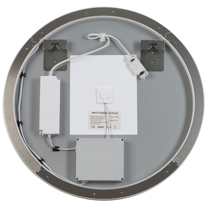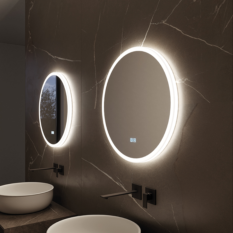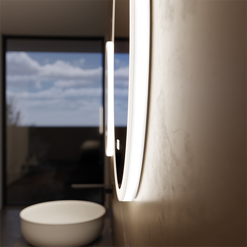 Der IO-Spiegel ist ein Spiegel mit integrierter zweifarbiger D-Motion-Perimeter-Lichtquelle, der für die Wandmontage in Badezimmern oder Garderoben geeignet ist. Er ist mit zwei Touch-Schaltern ausgestattet, die das Ein- und Ausschalten, die Einstellung der Lichtintensität (10-100 %), die Wahl der Farbtemperatur (2700 oder 4000 Kelvin) und die Aktivierung des Beschlagschutzes steuern. Integriertes Netzteil.
