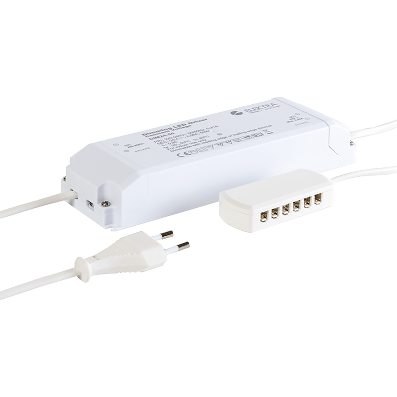 weiss, Primärleitungen 3000 mm mit Euroflachstecker, Sekundäranschluss LED mit 6/12-fach Verteiler, 24 Volt DC, dimmbar über Phasen An- / Abschnittsdimmer, Ausführung als Dreh- oder Tastdimmer möglich, flickerfrei