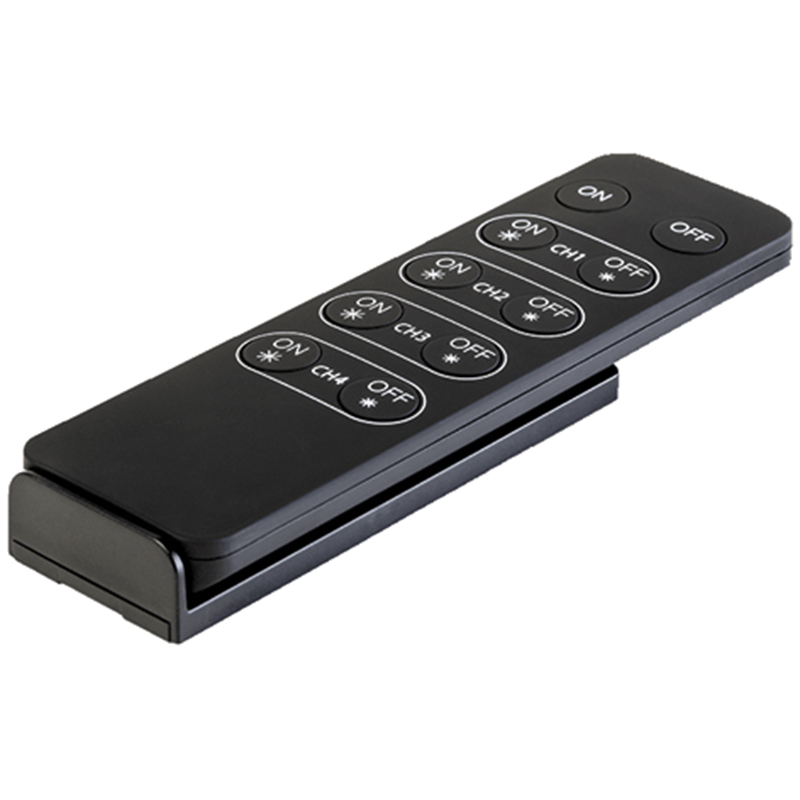 schwarz, Belastung 4x 5 A, Funktion 1 x 4-Kanal Funkfernbedienung und 1x 4-Kanal Empfänger = 4 einzelne Kanäle per Funk an einem Empfänger anwählbar, ergonomisches 10-Tasten Layout, mit Halterung magnetisch, 1 Batterie