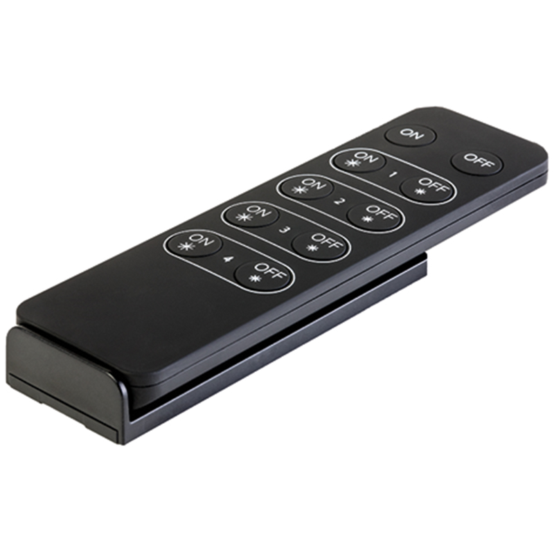 schwarz, Belastung 4x 5 A, Funktion 1 x 4-Zonen Funkfernbedienung und 4x 4-Zonen Empfänger = 4 einzelne Zonen (1 Zone / Empfänger) per Funk anwählbar, ergonomisches 10-Tasten Layout, mit Halterung magnetisch, 1 Batterie