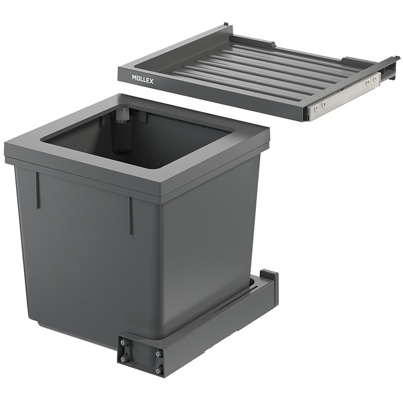 anthrazit, für jede handelsübliche Auszugsschublade mit einer Schubladentiefe von 400 - 500 mm, für Korpuswandstärke 16 / 19 mm, das X45 M35 Basic Abfallsystem ist die schmalste X-Line Garnitur mit einer reduzierten Höhe, der darin enthaltene Hauptbehälter und die Basic Schublade haben in fast jedem Küchenschrank Platz, dank X-Line Spannfingern kann trotz der niedrigeren Höhe ein gebührenpflichtiger 35 Liter Müllsack randvoll befüllt werden, einfachere Sackeinspannung mit vier beweglichen Sackspannern, Basicschublade als zusätzliche Ablagefläche