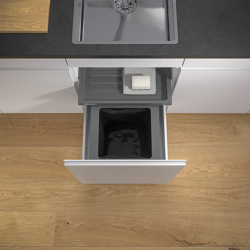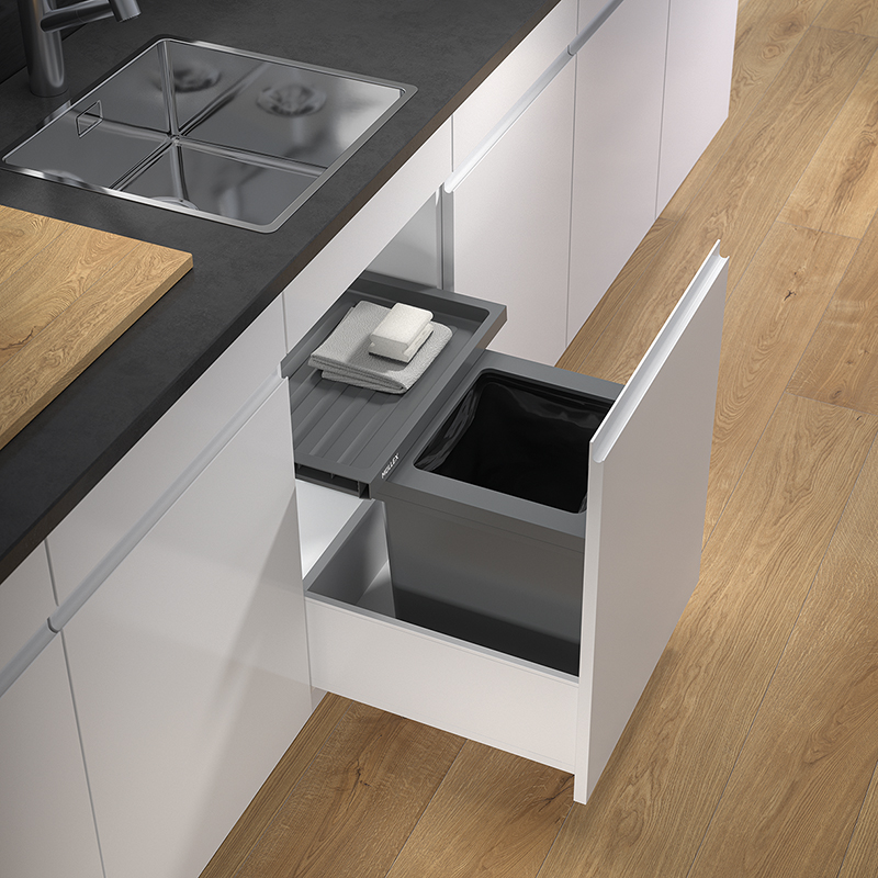 anthrazit, für jede handelsübliche Auszugsschublade mit einer Schubladentiefe von 400 - 500 mm, für Korpuswandstärke 16 / 19 mm, dank dem durchdachten Design passt diese Garnitur in niedrigere Unterschränke, der Hauptbehälter mit 35 Litern Fassungsvermögen und die ergänzende Basicschublade sind für Korpusse mit einer Breite von 500 mm ausgelegt, somit bietet die Ausführung neben dem Mülleimer noch zusätzlichen Stauraum für Putzutensilien, einfachere Sackeinspannung mit vier beweglichen Sackspannern, Basicschublade als zusätzliche Ablagefläche