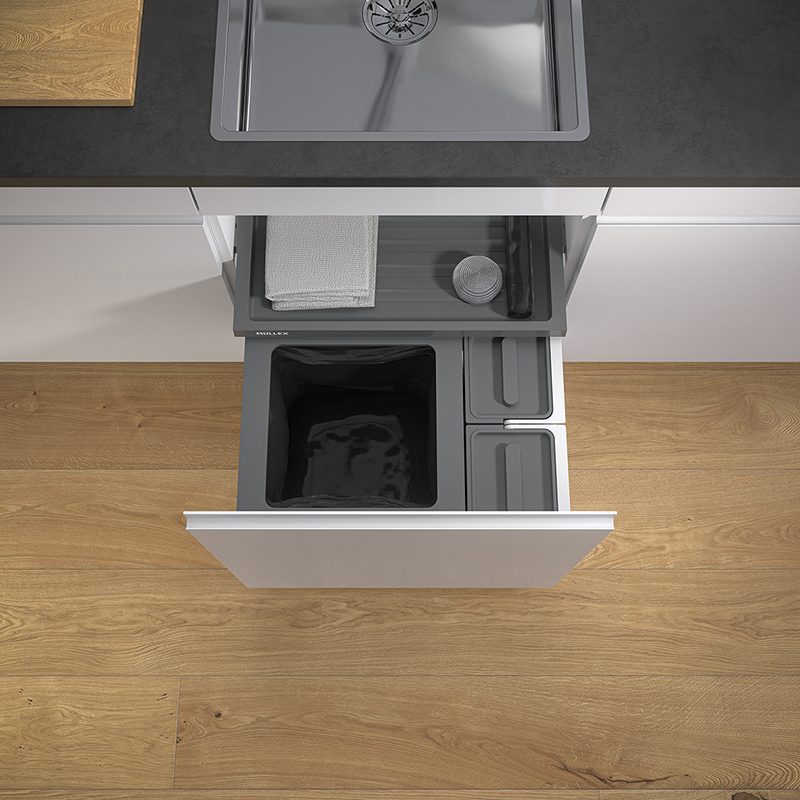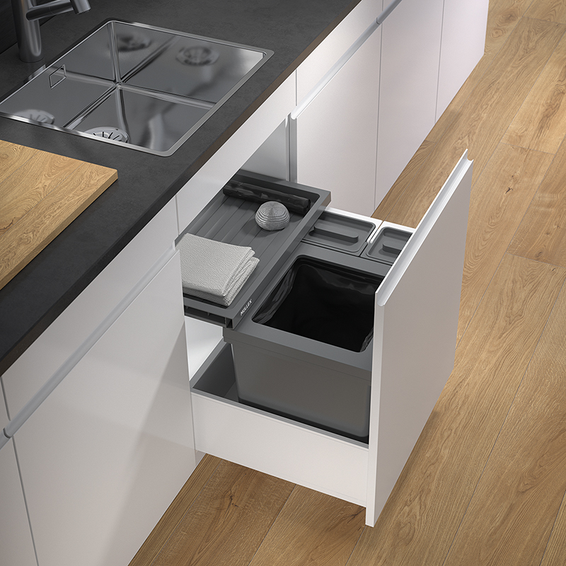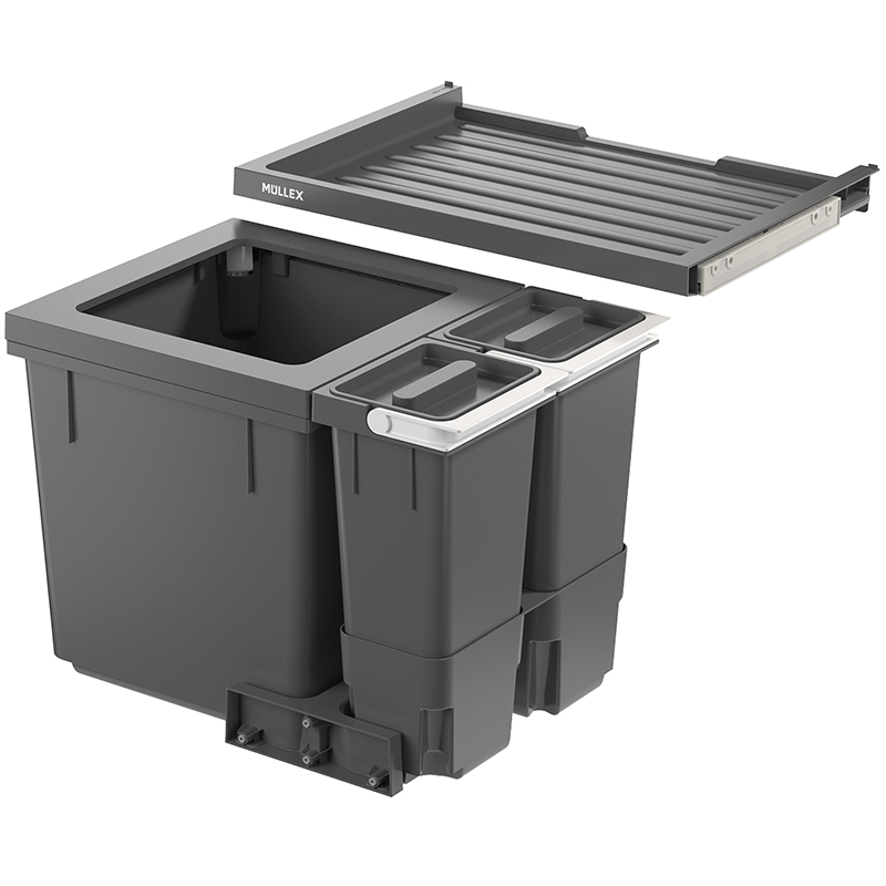 anthrazit, für jede handelsübliche Auszugsschublade mit einer Schubladentiefe von 400 - 500 mm, für Korpuswandstärke 16 / 19 mm, wurde für Haushalte mit niedrigeren Schubladenauszügen entworfen, die zwei Zusatzbehälter mit je 4 Liter Volumen bieten Platz um zum Beispiel Biomüll zu sammeln oder Geschirrspültabs zu lagern, für den Müllsack ist der 35 Liter grosse Hauptbehälter optimal, einfachere Sackeinspannung mit vier beweglichen Sackspannern, Basicschublade als zusätzliche Ablagefläche